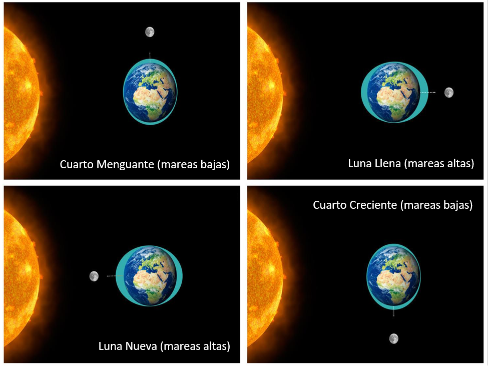 Cuando el ángulo que forma la Luna respecto a la Tierra y el Sol es de 90 grados (como en la primera y la última imagen) la fuerza que ejerce sobre los mares es menor, y se producen las mareas bajas. Según esto, es cuando la Luna está en Cuarto Menguante o Creciente. Cuando el Sol interviene también en este proceso, alineándose con la Luna, se producen las mareas altas, es cuando hay Luna Llena o Nueva.