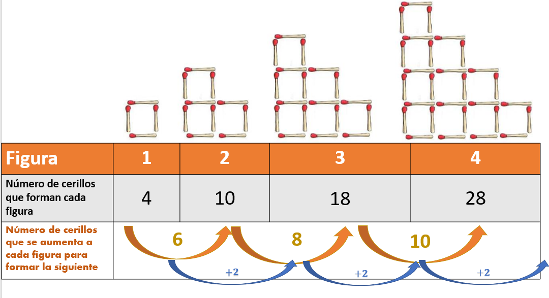 Y encontraste que la primera sucesión, la que corresponde al número de cerillos que se aumentan, tiene progresión aritmética porque la regularidad implica agregar dos cerillos más entre cada dos términos consecutivos, esa es la regularidad de la primera sucesión.