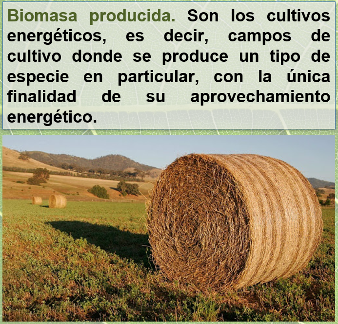 - Biomasa producida. Son los cultivos energéticos, es decir, campos de cultivo donde se produce un tipo de especie en particular, con la única finalidad de su aprovechamiento energético.