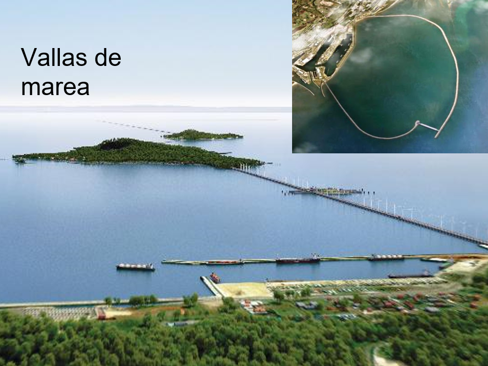 - Otro de los métodos son las vallas de marea, las cuales, por decirlo de una manera simple, combinan los dos métodos anteriores. Se colocan largas barreras con turbinas, pero que no encierran un área, como las presas, parten desde la costa y se internan en el mar.