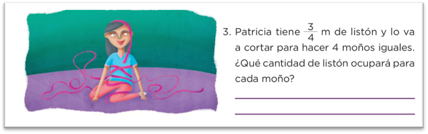 Como datos tenemos que: Patricia tiene tres cuartos de metro de listón y debe hacer 4 moños iguales.