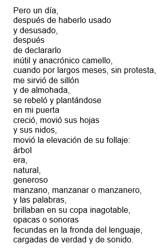 Fascina el motivo del poema, es decir, tu querido tumbaburros, a quien comienzas a querer como a una especie de primo cercano. Al respecto, te encanta comprobar, una vez más, que es posible escribir un poema sobre cualquier motivo: la poesía, un soneto, la danza, la orilla del mar, un albañil, un diccionario y un etcétera infinito.
