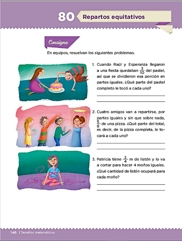 Como puedes ver existen situaciones donde uno debe ser equitativo, para conocer más del tema, deberás resolver del Desafío 80 de la página 146 del libro de texto, sexto grado.