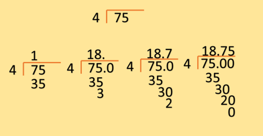 También, y como lo acabamos de ver, podemos dividir 3 entre 4 y es lo mismo que 75 centésimos de metro o 75 centímetros. Esa es la cantidad de listón que se va a usar para hacer los moños.