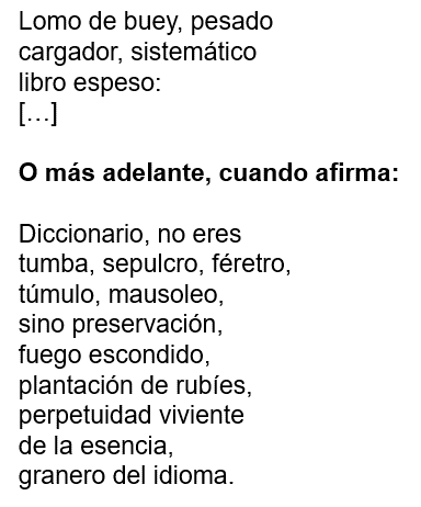 La forma en que el yo poético describe al diccionario y su relación con él, hablándole en segunda persona del singular, es decir, de tú, con un tono afectuoso y hasta cierto punto lúdico; de este modo, el diccionario termina convertido en una especie de personaje, como puedes observar, por ejemplo, en los versos iniciales: