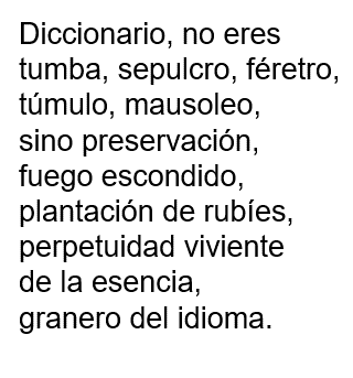 Los elementos que el yo poético destaca del diccionario reflejan, parte fundamental de la esencia y “personalidad” de esta clase de libro. Se destaca este aspecto, pues seguro que Neruda, para poder escribirlo, debió dedicar mucho tiempo a contemplar el motivo de su poema y, sobre todo, a reflexionar en torno a él, además, si te fijas en las descripciones podrás percatarte de que incluyen pocos adjetivos, adverbios y frases adverbiales (sólo las indispensables). Eso es, en parte, consecuencia de lo anterior, de la observación y de la búsqueda de la palabra precisa para expresar sensaciones, emociones, sentimientos y pensamientos. En estos versos, como resulta evidente, puedes apreciar también la forma en que el yo poético platica sobre su descubrimiento de la utilidad del diccionario.