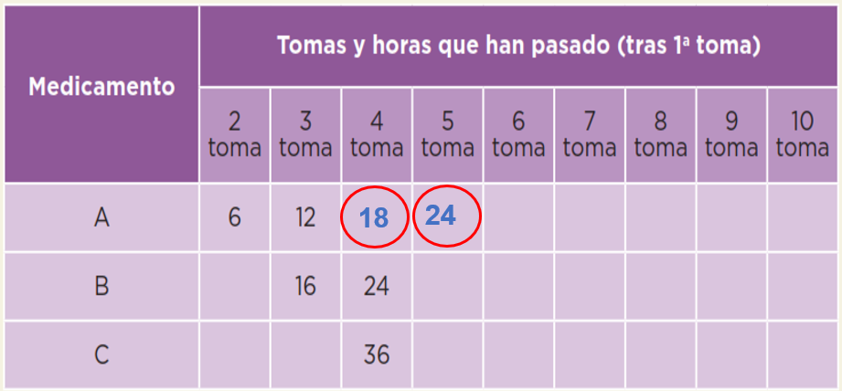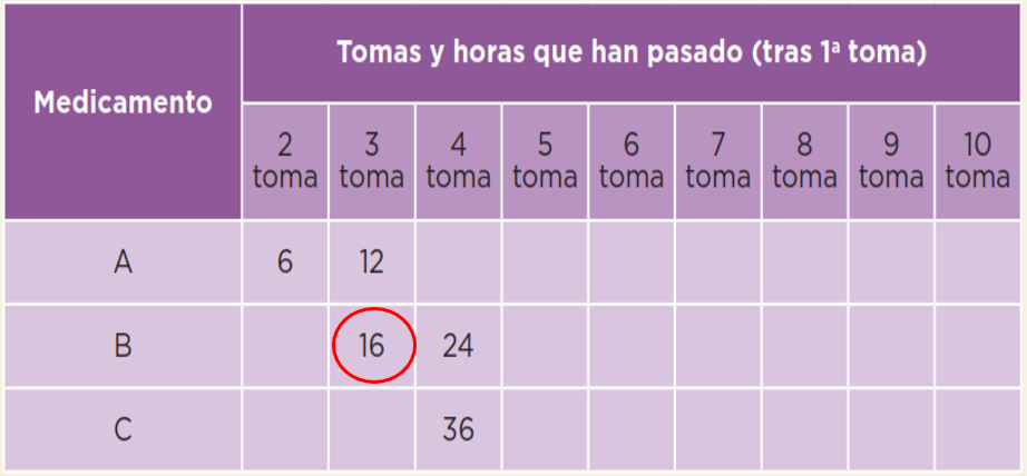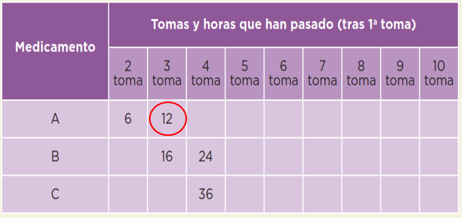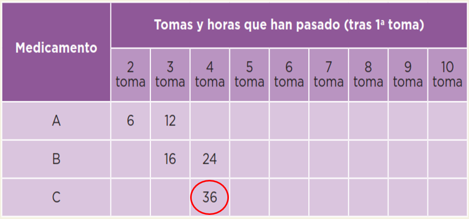 Entonces el 36 que aparece en el renglón del medicamento C, representa el número de horas que han transcurrido entre la tercera y primera toma, porque va de 12 en 12 horas.