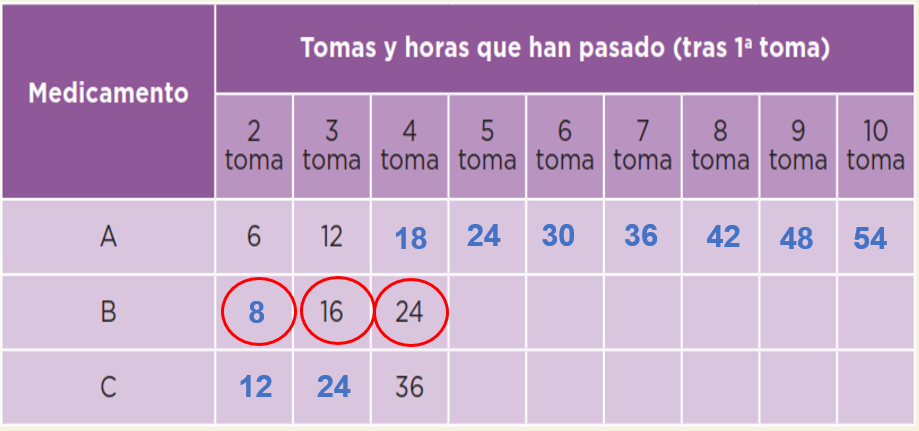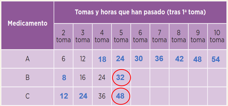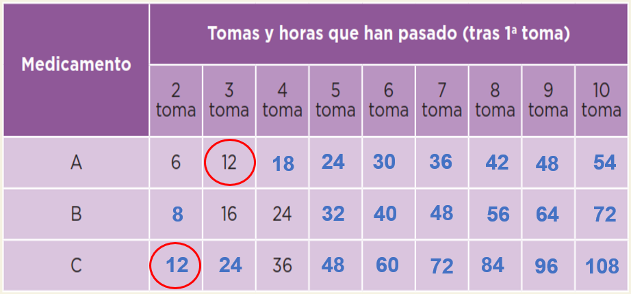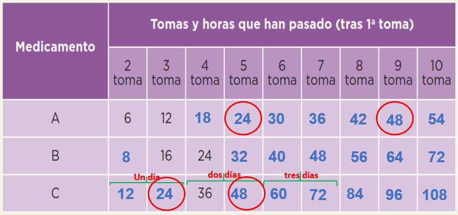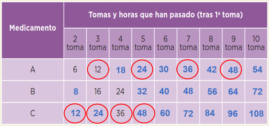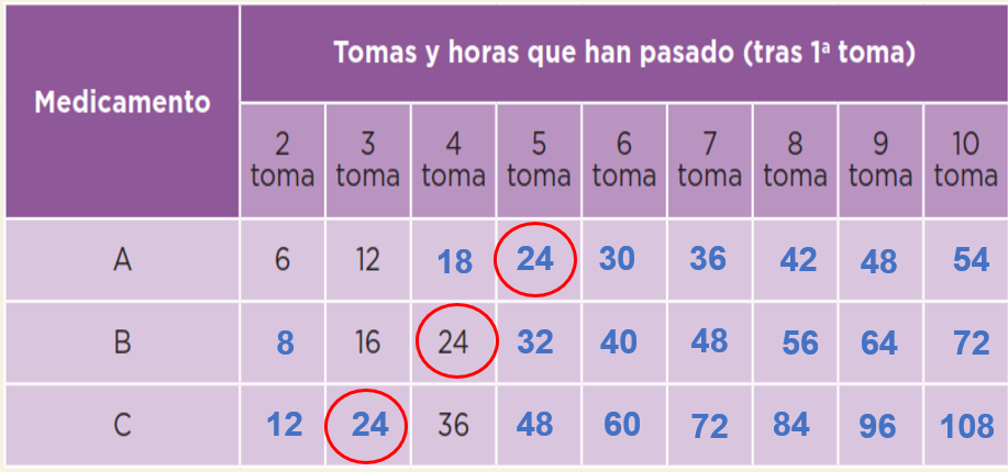 Esto tiene relación con algo que has estudiado antes. Precisamente, debido a que son múltiplos de 24 coinciden las tomas de los tres medicamentos al cumplirse un día, dos días o tres días de tratamiento porque 24 es un múltiplo que tienen en común de 6, 8 y 12. Estos números representaron la periodicidad de las tomas de cada medicamento.