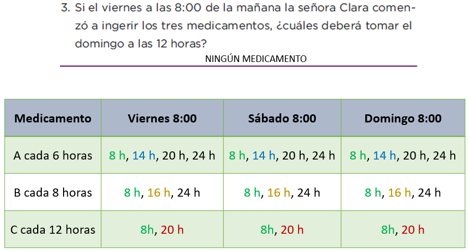 - Si el viernes a las 8:00 de la mañana la señora Clara comenzó a ingerir los tres medicamentos, ¿Cuáles deberá tomar el domingo a las 12:00 horas?