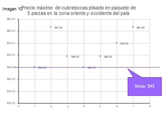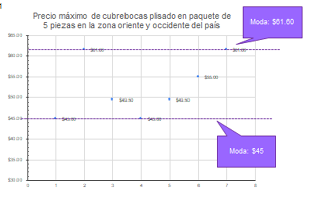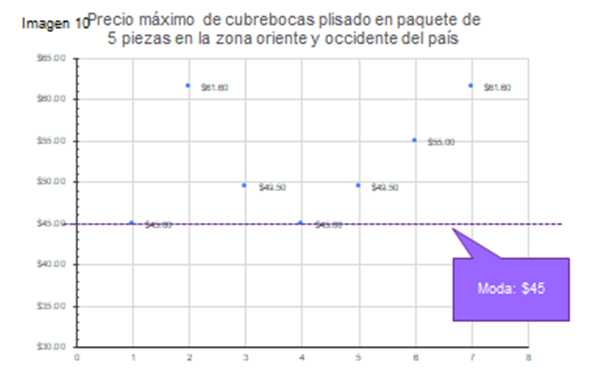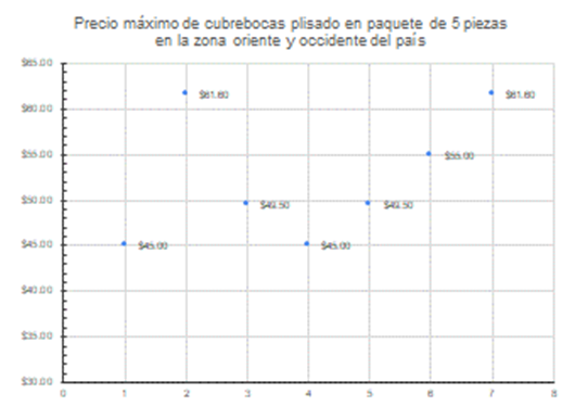 El otro ejemplo de conjunto que se puede obtener es el del precio máximo de cubrebocas plisados en bolsa de 5 piezas, ese conjunto está formado por 7 datos.
