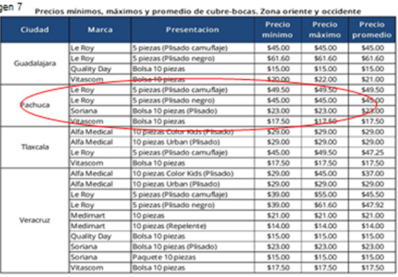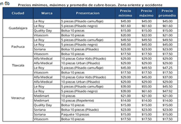 Observa, aparece la zona del país a la que corresponde, así como las ciudades en que se investigó el precio de los cubrebocas por marca y presentación; así como los precios mínimo, máximo y promedio de cada uno.