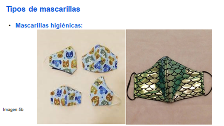 - Mascarillas higiénicas también llamadas de tela, ya que están confeccionadas con distintas combinaciones de telas, diferente cantidad de capas y formas. No hay un diseño, selección del material ni forma que sean únicos, por lo que la combinación ilimitada de telas y materiales da lugar a una mayor posibilidad de filtración y dificultades para respirar.