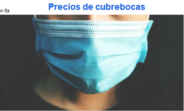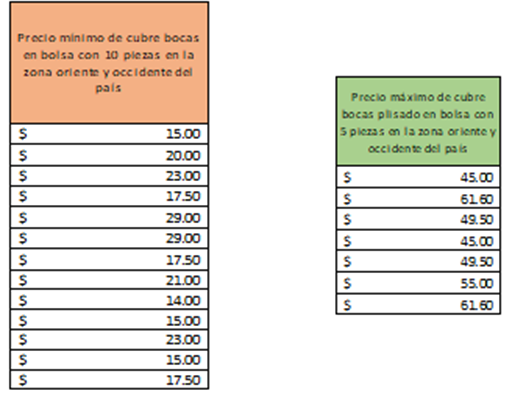 Pues así es, observa la tabla que muestra los datos que encontramos relacionados con el precio de cubrebocas.