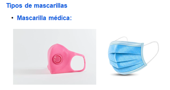 - Mascarilla médica. Son las que están certificadas de conformidad con normas internacionales. Está diseñada para usarse una sola vez, se caracteriza por un alto nivel de protección de filtración inicial, posibilita respirar y tiene resistencia a líquidos corporales.