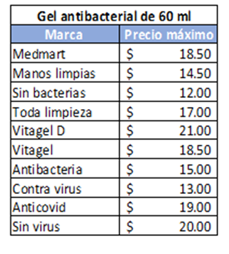 Ahora te proponemos aplicar tus conocimientos obteniendo las medidas de tendencia central del precio máximo del gel antibacterial de 60 mililitros para determinar cuál es la medida que mejor representa y resume. Observa los datos y contesta en tu cuaderno.