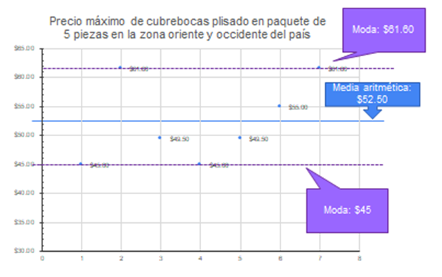 Para obtener la media aritmética, primero debes sumar los siete datos y luego dividir la suma entre 7 puedes utilizar tu calculadora para hacer las operaciones. El valor que tiene la media aritmética es de 52.50 pesos, ese es el precio máximo promedio de los cubrebocas en esa presentación.