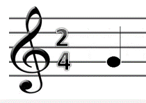 Recuerda que en el compás de 2/4 la porción de tiempo queda dividida en dos partes. Una negra ocupará cada parte y una blanca el compás entero.